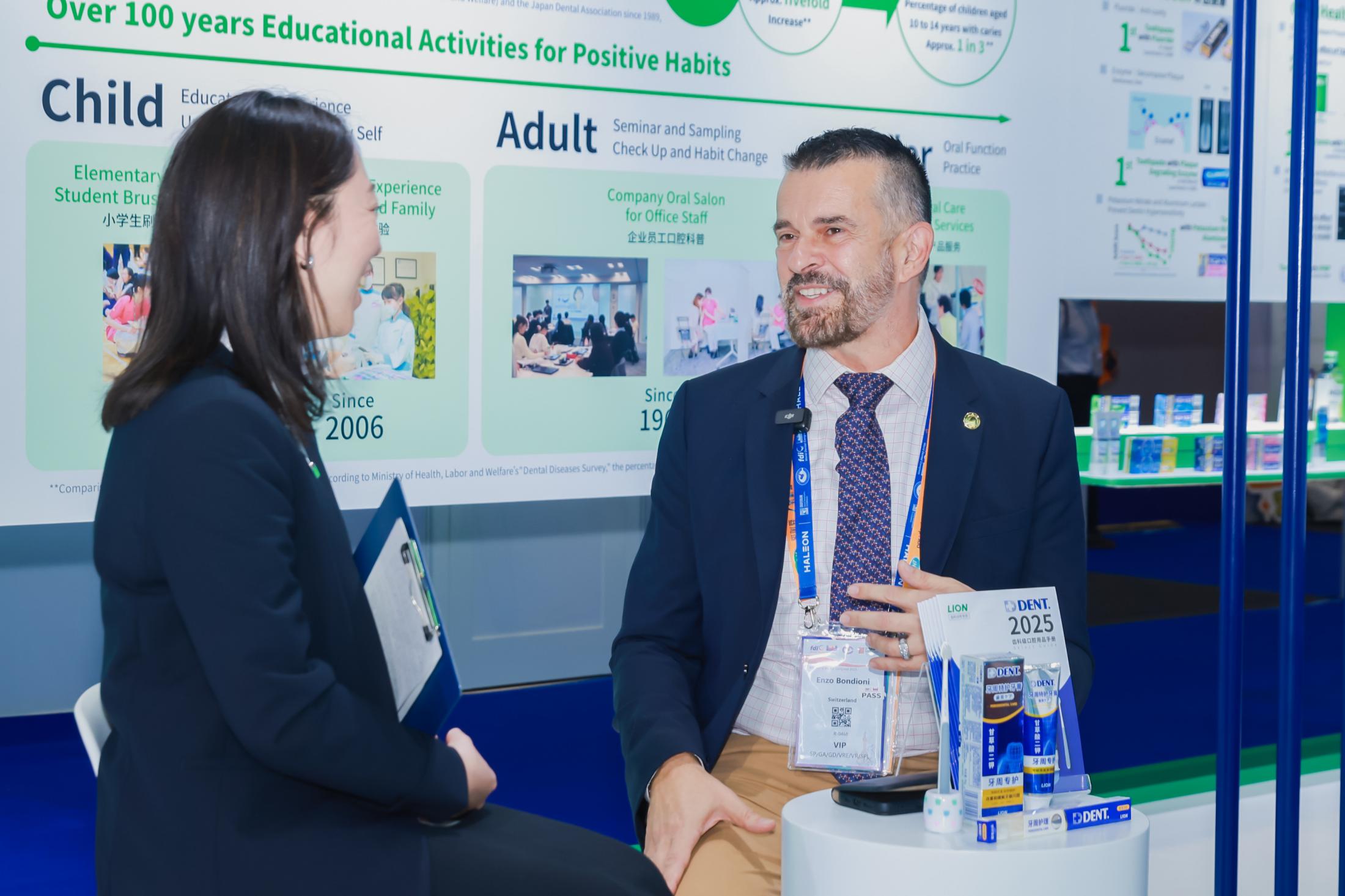 在FDI世界口腔医学大会期间,狮王集团特别邀请FDI世界牙科联盟执行总监Enzo Bondioni进行了深度对话。Bondioni先生充分肯定了狮王长期以来为推动全球口腔健康事业所做出的努力,他强调,当前全球口腔健康领域仍面临重大挑战——即如何让更多人意识到“口腔健康与全身健康同等重要,是其不可分割的一部分”。狮王及旗下专业齿科品牌DENT所秉持的“预防与治疗同等重要”理念,与FDI推动的全民口腔健康目标高度一致。他表示,未来亟需更多如狮王这样的企业,与牙科专业人士、学术机构深化协作,共同推动科学可及的护理方案普及。